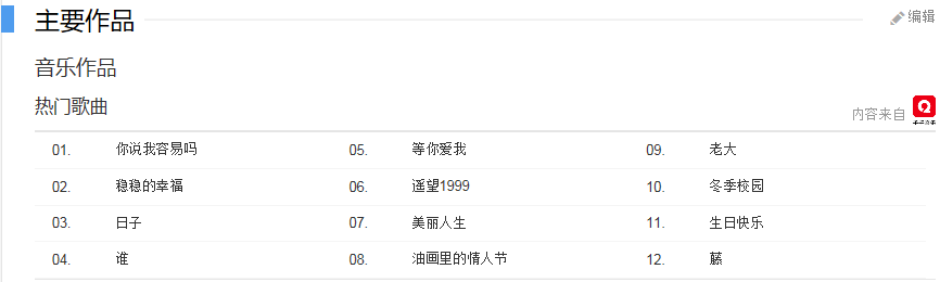 代表作品:因為愛情,北京歡迎你,等你愛我,誰,日子,歸去來,穩穩的幸福,最熟悉的陌生人、我變了我沒變
